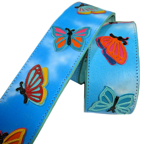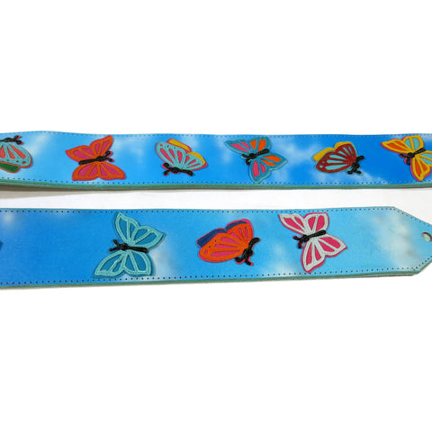 The background of this leather guitar strap is airbrushed sky and clouds, created by the fabulously talented, Bass-master and artist, David Karns. The Butterflies are created from Kidskin leather, which are glued, then meticulously sewn to the strap. We have perfected creating serious art for your guitar that will last at least one lifetime!