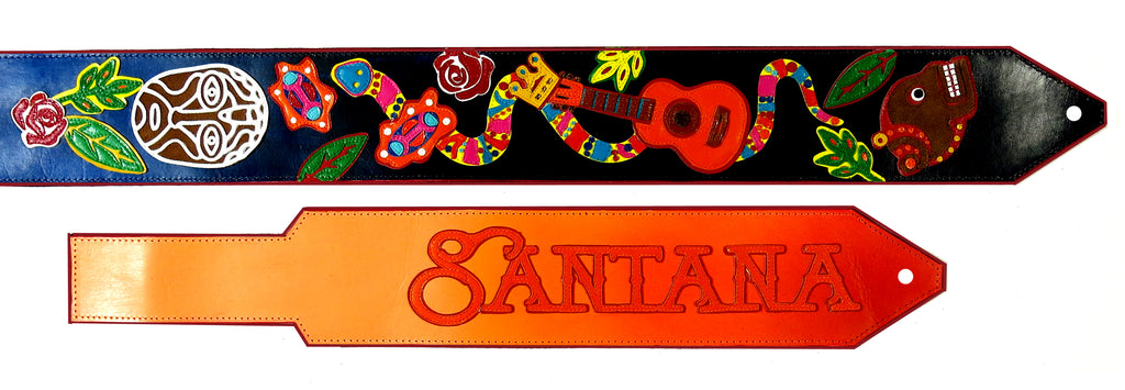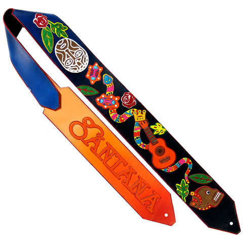 For this guitar strap, we started out with a 3 inch wide, flexible piece of Veg-Tanned leather that we treated with our top-secret softening process. The front and back portions were then airbrushed Ombré, blue to black in the front and orange to red on the back portion of the strap. We added Kidskin layered images inspired by Michael Rios' Santana Album artwork Our Kidskin overlays are glued, then meticulously stitched to the strap. This guitar strap is backed with high quality black Suede.