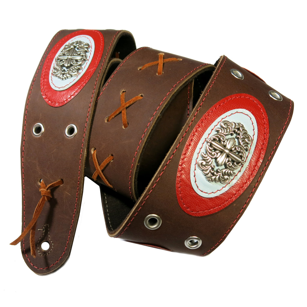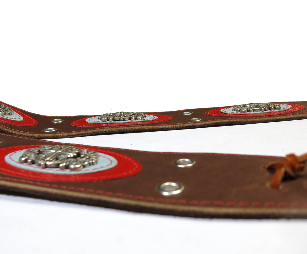 The strap is cut to 2.75 inches wide, with Red and Light Blue Kidskin layered overlays and gorgeous, high quality Filligree Conchos. The strap is laced with Warm Brown Suede "X's"and top-stitched with red thread. The strap is backed with high quality Suede, and we've used our signature oxidized buckle for adjustment.