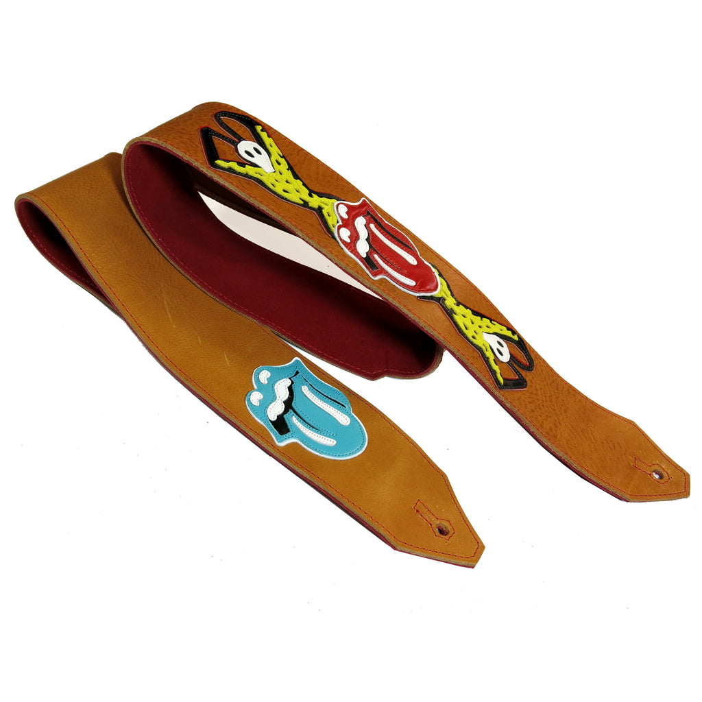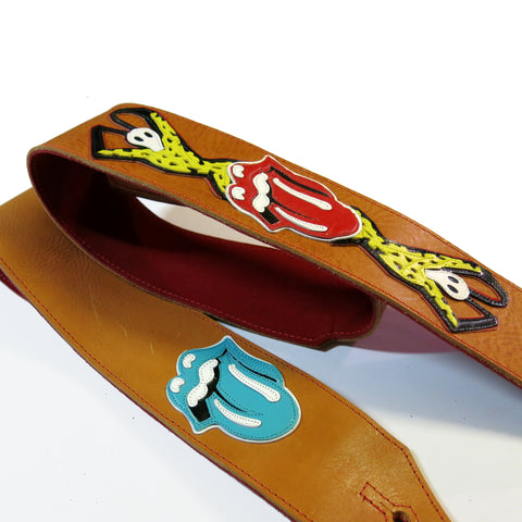 For this guitar strap, we started out with a thick, pebble grained, warm Gold leather base, cut to 2.75 inches wide and added our Kidskin layered Voodoo Lounge and Lips designs, which are glued, then meticulously stitched to the strap. We backed the straps with high quality Suede.