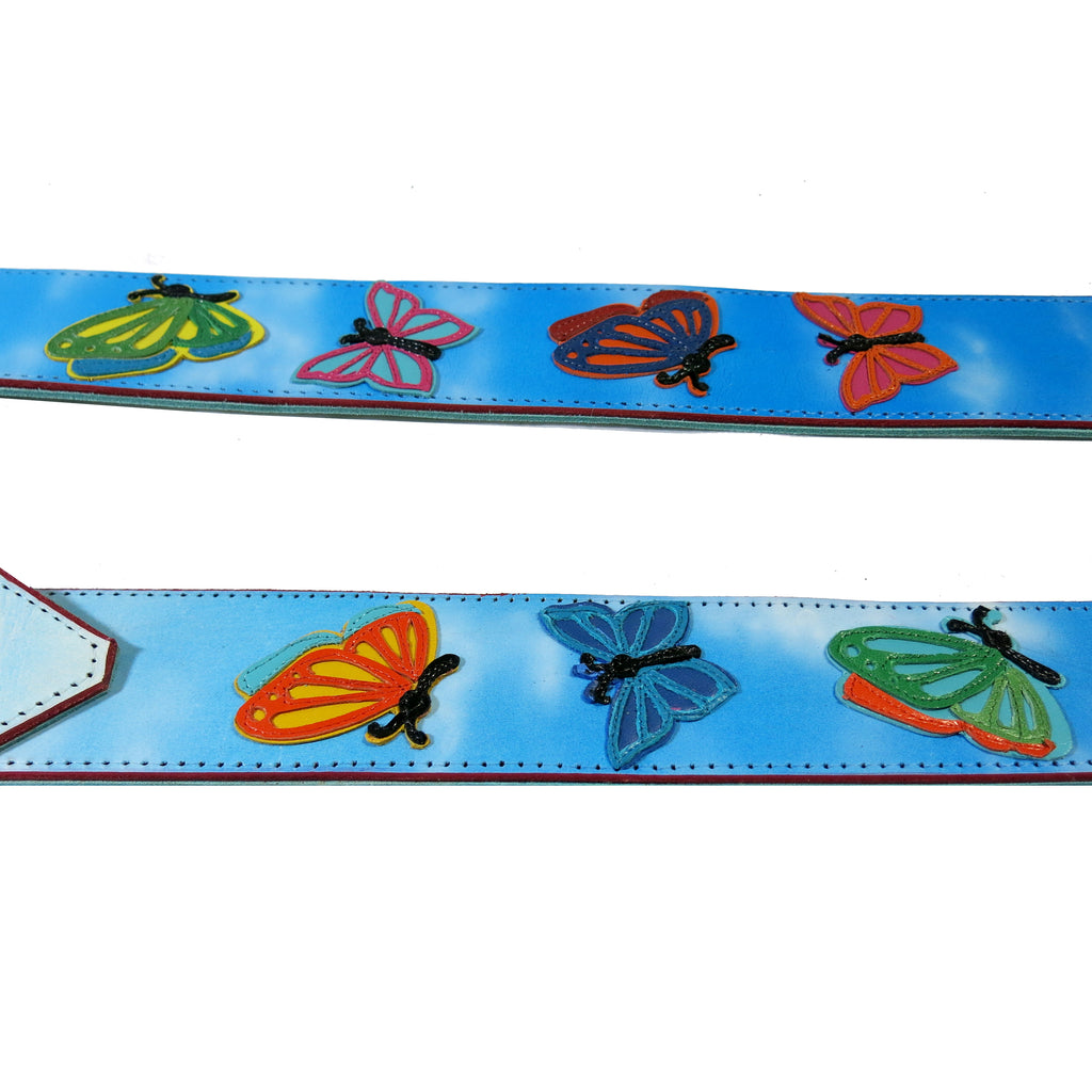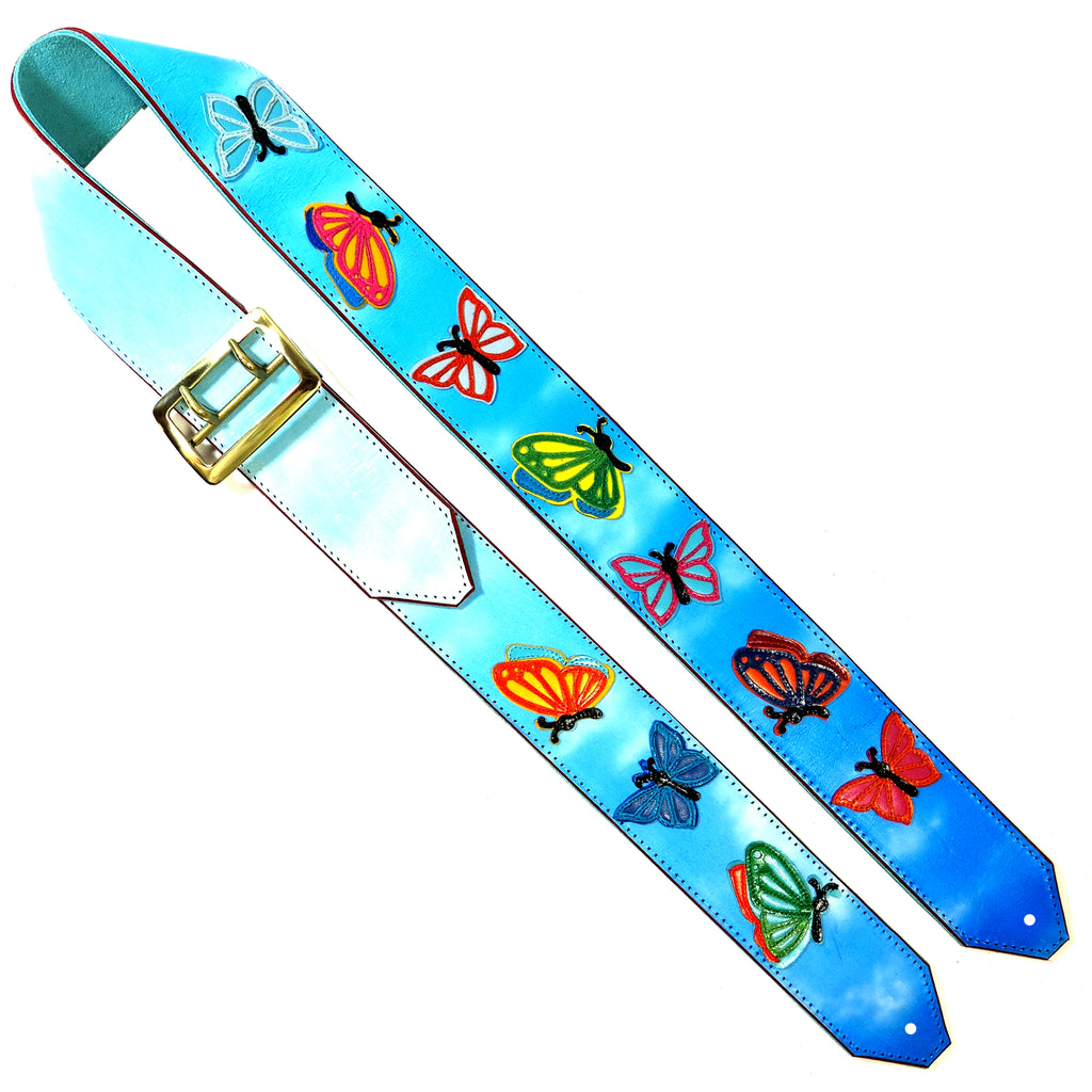The background of this leather guitar strap is airbrushed sky and clouds, created by the fabulously talented, Bass-master and artist, David Karns. The Butterflies are created from Kidskin leather, which are glued, then meticulously sewn to the strap. We have perfected creating serious art for your guitar that will last at least one lifetime!