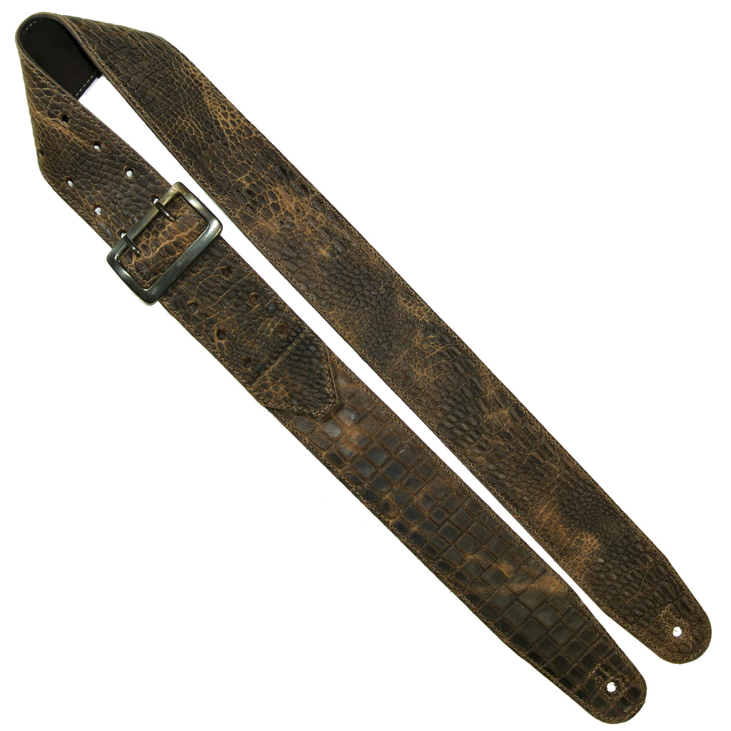 This strap is cut to 2.25 inches wide, and backed with brown Suede. We have two in stock, both cut to our Long length, but they can be cut down to our Regular (43-50 inches), or our Standard length (46-54 inches).