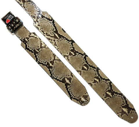We hand-select our python skins for our Randy Rhoads Python guitar strap, we only use skins that match the design on Randy's strap. We use thick, perfect skins to create the perfect guitar strap, and for the Randy Rhoads replica, we cut the most beautiful part of the skin, to create a replica like no one else! The strap is cut the same as Randy's, 3.5 inches wide. We layer the Python over a leather strap, then back the strap in high quality suede. The way we create these, they mold to the wearer's body and are built to last at least one lifetime.