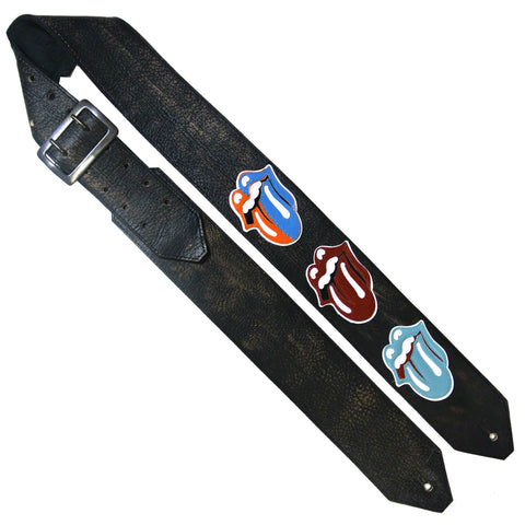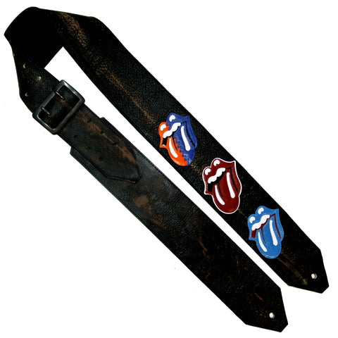 This One of a Kind Rolling Stones guitar strap was created with Vegetable Tanned leather that was crackle painted black over gray, then hand distressed. The edges were beveled and dyed red. There are 8 lips created from layers of Kidskin leather, that were glued then meticulously sewn to the strap. We just caught the Stones on tour, and poor Ronnie only has 3 lips on his strap!