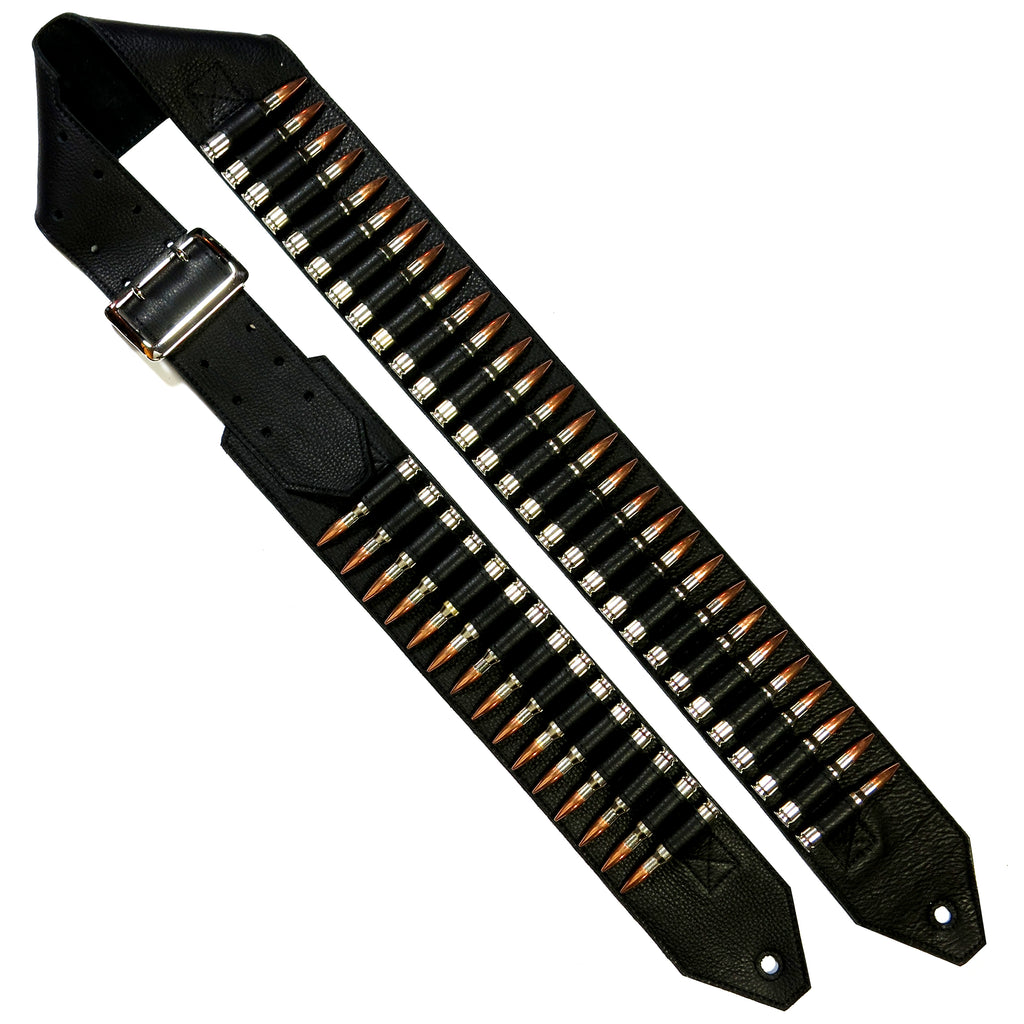 We use a velvety soft black Pebble Grained leather and stitch each bullet casing individually. We make them snug, so the bullets are held in place. The strap itself is 3.5 inches wide, which helps to lift the weight of your guitar and the strap itself!